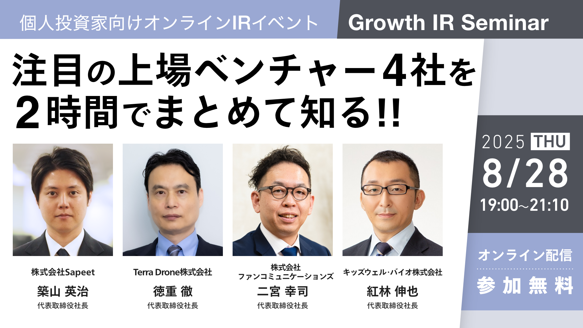 Growth IR Seminar 2025年8月28日(Sapeet、Terra Drone、ファンコミュニケーションズ、キッズウェル・バイオ)2025年08月28日 -